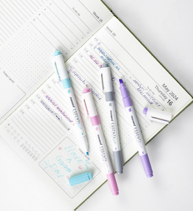 - dwustronny zakreślacz z końcówkami ściętymi o różnych grubościach (2 mm, 4 mm)